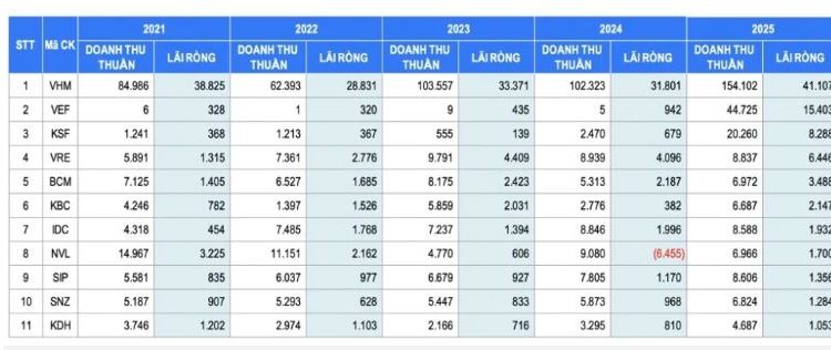 Kinhtetrithuc.vn – Năm 2025, có 11 doanh nghiệp bất động sản niêm yết ghi nhận lợi nhuận trên 1.000 tỷ đồng, mức cao nhất trong 5 năm.