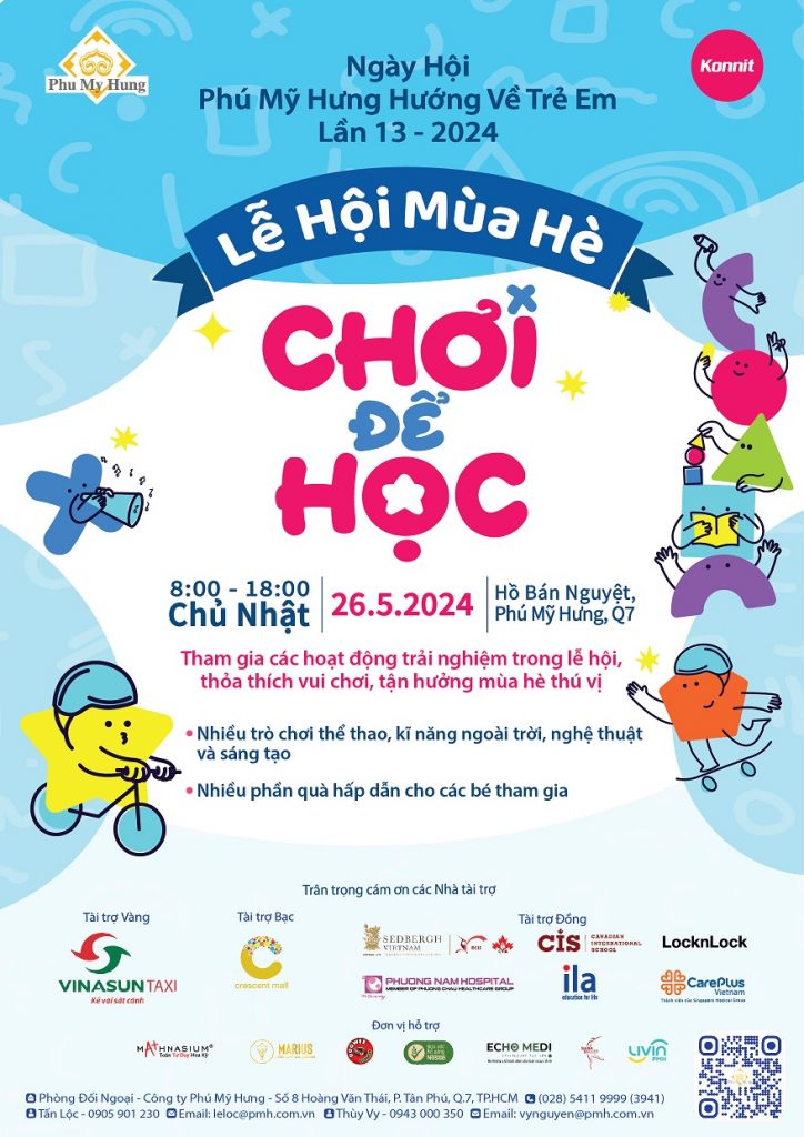 Kinhtetrithuc.vn – Ngày hội “Phú Mỹ Hưng Hướng Về Trẻ Em” lần 13 sẽ diễn ra từ 8:00 – 18:00 ngày 26/5/2024 tại khu Hồ Bán Nguyệt, đô thị Phú Mỹ Hưng, quận 7, TP.HCM với chủ đề: Lễ hội mùa hè – Chơi để học. Ngày hội do Công ty Phú Mỹ Hưng và Công ty TNHH Konnit Group đồng tổ chức.