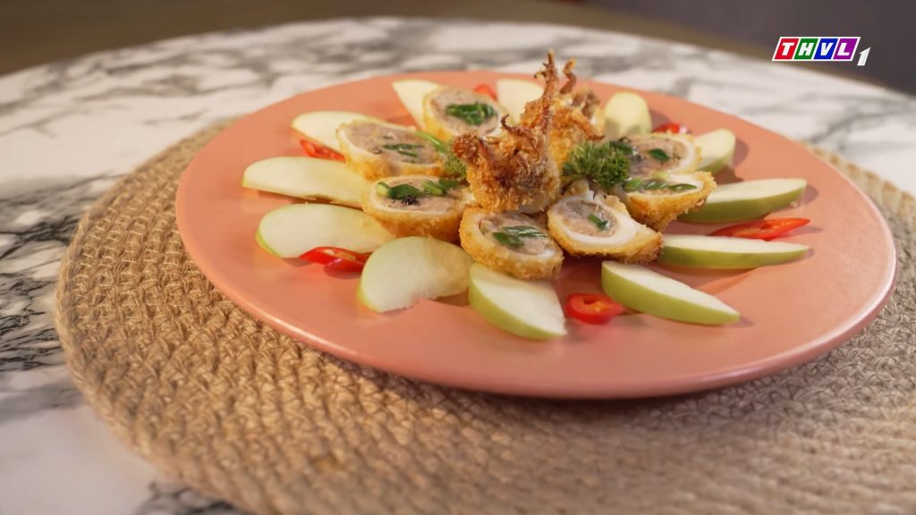 Khi mực đã chín thì lấy ra lăn bột và đem đi chiên giòn. Khi mực ngả vàng thì dọn ra trang trí cùng táo xanh và thưởng thức.